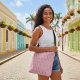 This large shopping tote not only has a gorgeous design with pink frangipani flowers on each side, it is soft, roomy and has a wide adjustable strap that fits across the body. Excellent printing. True to the picture.