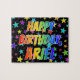 This exciting and fun birthday-themed jigsaw puzzle design has the message "HAPPY BIRTHDAY, ARIEL" with the characters having a colourful rainbow spectrum inspired gradient pattern, in addition to a lively star shapes background pattern. A colourful puzzle like this might be a fun way to send a birthday greeting message to somebody named Ariel. [~Z0000468]