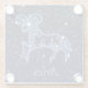 Glass coaster featuring the zodiac symbol for Aries in soft silver blue, overlaid with the stars of the constellation, against a starry sky background graded from deep midnight blue to black.