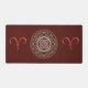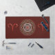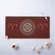 This mandala was designed for the zodiac sign, Aries, depicting a red jasper stone in the centre surrounded by elements representing the sign, such as the symbol for the sign, the constellation, and the alchemical symbol for Fire, as well as filigree vines and weaves wrapping it all into a solid image in shades of red, silver, and brown.