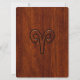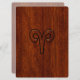 An Aries zodiac symbol on a brown mahogany wood grain style decor print background. A modern urban racy design for a great custom birthday gift idea.