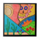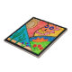 Desert ceramic tile, with a collage showing a guitar, skull and cactus images. This fun image uses bright colours of red, blue, purple and yellow. A perfect blend of Arizona and Mexico creating a unique mixed media folk art piece.