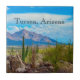 Tucson, Arizona ceramic tile, with a photo of a desert southwest afternoon before a summer monsoon. This photo shows a view of the western edge of the Catalina Mountains. With simple black lettering, you can add your own text. A fun nature inspired item for your southwestern home decor.