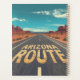 This bold graphic illustration captures the iconic feel of an endless Arizona road cutting through a vast desert landscape. Cracked yellow road lettering, dramatic red rock formations, and a striking turquoise sky create a powerful sense of solitude, freedom, and adventure. The symmetrical composition and stylized details draw the eye forward, evoking classic American road trips, Southwest travel culture, and the spirit of open highways.