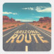 This bold graphic illustration captures the iconic feel of an endless Arizona road cutting through a vast desert landscape. Cracked yellow road lettering, dramatic red rock formations, and a striking turquoise sky create a powerful sense of solitude, freedom, and adventure. The symmetrical composition and stylized details draw the eye forward, evoking classic American road trips, Southwest travel culture, and the spirit of open highways.