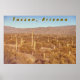 The image showcases a vast desert landscape dominated by a multitude of saguaro cacti, their tall, slender forms reaching towards a clear blue sky. The cacti are scattered across a terrain of dry, brown brush, creating a sense of aridity and solitude. In the distance, a range of low, brown hills adds depth to the scene.