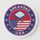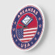 Badge of Arkansas with flag of Arkansas and flag of USA colours, rounded shape.