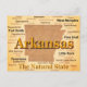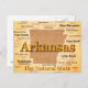Aged antique paper Arkansas state pride image including map silhouette with cities, towns, The Natural State.