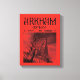 This graphic poster casts Arkham Asylum, the notorious psychiatric hospital from the Batman universe, in a haunting light. The entire scene is bathed in a sinister red hue, enhancing the gothic architecture and barren trees that encircle the asylum, creating a sense of dread and foreboding. The moon glows ominously in the background, illuminating the twisted branches that seem almost to reach out from the darkness. Bold, stylised lettering spells out "ARKHAM ASYLUM" at the top, with a clever tagline "RESTRICTED - Requires Accompanying Hero" that adds a playful yet dark twist to the piece. This artwork brilliantly captures the eerie essence of one of Gotham's most infamous landmarks, making it a striking collectable for fans of the darker side of the Batman saga.