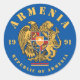The national coat of arms of Armenia is centered between the country name above, and below, the official name of the country in English. The year of independence is split on either side of the emblem, with the national flag placed just underneath the emblem.