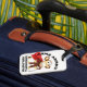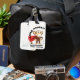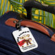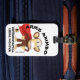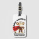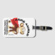 Luggage Tag black and white with "ARMS AKIMBO ENVIRONMENTAL CRIME FIGHTER THE CHEESBURGER" and with a picture of Arms Akimbo. Arms Akimbo is a Rainforest superhero. He has a very interesting back-story. Maybe I`ll tell it to you sometimes.