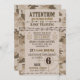 Desert colour camouflage print with barbed wire detail and military labels and a ghost print target birthday invitation card design.