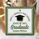 This modern army green and white custom square graduate Christmas ornament feature classy typography of your university or college name for the class of 2025. Customise with your graduating year next to the chic handwritten script and black grad cap for a great personalised congratulations graduation gift.