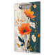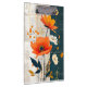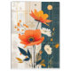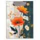 Painted poppies in orange combine with white flowers and orange berries on a mixed media background in dark blue-grey and almond-tan. Very beautiful, modern and abstract design.