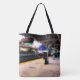 Calling all train lovers! The original photograph by ZoeSPEAK on this Tote Bag features a sleek blue engine pulling a train into the railroad station on Track 2. The red tile roof of the opposite platform and a palm tree can be seen in the bright tropical light.