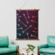 This is a fabric wall tapestry with a print of pink and red hues on a black background. NOTE: The tapestry is NOT woven, it is photo art of a woven design. The tapestry is trimmed with wooden top and bottom rails.
