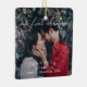 Double-sided our first Christmas ornament to which you can add two photos of you and you significant other. Our first Christmas is written across in a delicate white script. Add your names and the year you got engaged beneath two arrows pointing at a heart. ENGAGED in curved text.