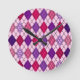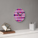 This wall clock has an art deco design of diamond shapes made from overlapping angles in black lines colored in shades of purple and pink with diagonal black lines making the design look like argyle