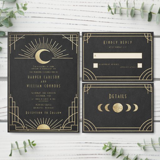 Elegant black and gold address labels in Art Deco style, perfect for wedding stationery suites. Please note: not real gold or foil.