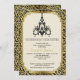Art Deco chandelier black, gold couples shower invitation featuring a black chandelier, a border in Art Deco style and black and golden floral damask on beige/ecru. This elegant design is a modern approach to a vintage/retro style that resembles that of the Roaring 20’s and The Great Gatsby. It is part of a wedding set and is completely customisable.