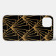 This phone case has an Art Deco design of diamonds and triangles in gold on a field of black.