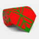 This tie has an art deco design of diamond shapes, and lines in green on a field of red.