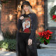 Women’s black Bella Canvas fine jersey t-shirt with an image of an woman dressed in Art Deco Christmas finery. She is sitting with her legs crossed and is resting her chin in her white-gloved hand on a starry night. Gold ornate Art Deco border. See the entire Holiday Apparel collection in the PARTY FAVORS section.