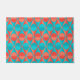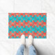 This doormat has an art deco design of two-toned orange and teal circles inside two-toned orange and teal triangles.