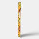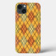 This phone case has an art deco design of diamond shapes made from overlapping angles in black lines coloured in shades of orange and yellow with diagonal black lines making the design look like argyle