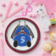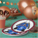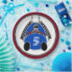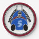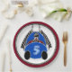 What Fun! Sure to delight both children & car racing fans, the design adorning this paper plate is an original digital painting by Leslie Sigal Javorek of a head-on view of a bright blue 1920’s Bugatti-inspired car and driver with chequered flags & tire marks trailing behind.