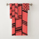 This towel set has an art deco design of vertical lines connected by diagonal lines in black on a field of coral.