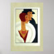 A woman in a red cloche hat, red dress, white fur stole, and beautiful ornate jewellery, poses with her handsome gentleman companion dressed in Homburg hat and overcoat, make an elegant couple in this signed Art Deco illustration of the 1920s. A perfect gift and memorabilia for the lover of vintage art! (Artist unknown).