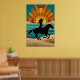 A unique fusion of retro glamour and western romance. This stylized illustration features the silhouette of a cowgirl riding a horse against a massive, radiating sunset. With a vibrant palette of orange, teal, and beige, and chevron patterns reminiscent of desert landscapes, this poster is perfect for rustic chic decor, a modern office, or a themed living room.