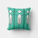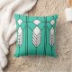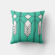 This throw pillow has an art deco stained-glass window design of diamonds and lines in white, black, and turquoise.