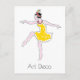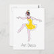 Illustration of a dancer in an Art Deco style. Dancing woman is wearing a yellow dress with a red collar. Easily personalise the this card by editing the template text. Text read Art Deco.