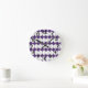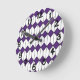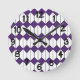 This all clock has an art deco design of white hexagons with a black line down the middle and purple diamonds.