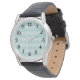 This men's watch has an art deco design of overlapping diamonds in verditer (green) and blue on a field of white.