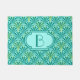 Digital reproduction of a classic, Art Deco fan pattern door mat with monogram - turquoise / peacock blue on pale aqua, embellished with gold