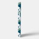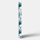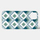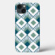 This phone case has an art deco design of teal diamonds with diagonal lines and seafoam green diamonds on a field of white.
