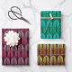 Wrapping paper in a vintage Art Deco wallpaper pattern based on a stylised feather - deep fuchsia pink and soft pink, on a black background, aqua and turquoise / peacock, on a deep teal background, and rust brown and light chamois yellow, on a dark chocolate brown background