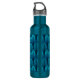 Water bottle in a vintage Art Deco wallpaper pattern based on a stylised feather - shades of turquoise / peacock blue on a dark navy / indigo blue background