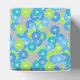 An Art Deco pattern based on a traditional, stylised chrysanthemum pattern used in Japanese textiles, in shades of blue, turquoise and lime green, outlined in white, on a light, silver grey background