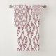 This towel set has an Art Deco design of diamonds connected by curved lines in brick red.