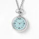 This women's watch has an Art Deco design of diamonds connected by curved lines in turquoise.
