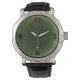 Oversized men's watch featuring an original,  unique Art Deco face,  suggesting a glowing jade green light.   The "12" is in coral red,  while the other numerals are in a shiny-appearing black.