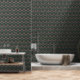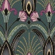 This deep rich toned deco design gives a wonderful 1920s flavor to any room. Deep teals and dusty pink with black accents make a rich combination.