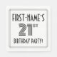 This elegant and 1920s-1930s style inspired twenty-first birthday party/celebration paper napkin design features a personalised name, an intricate art deco look inspired number “21st”, the message “BIRTHDAY PARTY!”, and a border pattern consisting of lines. Paper napkins like these might be used at a party for somebody who is celebrating their twenty first birthday. [~Z0000613]