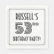 This luxurious fifty-third birthday party/celebration paper napkin design features a personalised name, an intricate art deco look inspired number “53rd”, the message “BIRTHDAY PARTY!”, and a border pattern consisting of lines. Luxurious birthday themed paper napkins like these might be used at a party in celebration of somebody’s 53rd birthday. [~Z0000613]