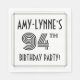 This elegant and 1920s-1930s style inspired ninety-fourth birthday celebration paper napkin design features an editable name, a fancy art deco style inspired number “94th”, the message “BIRTHDAY PARTY!”, and a multi-line border. Elegant birthday themed paper napkins like these might be used at a party in celebration of somebody’s 94th birthday. [~Z0000613]