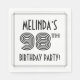 This elegant and Roaring Twenties inspired ninety-eighth birthday celebration paper napkin design features a personalised name, a fancy art deco style inspired number “98th”, the message “BIRTHDAY PARTY!”, and a border pattern consisting of lines. Birthday themed paper napkins like these might be used at a party celebrating somebody’s 98th birthday. [~Z0000613]
